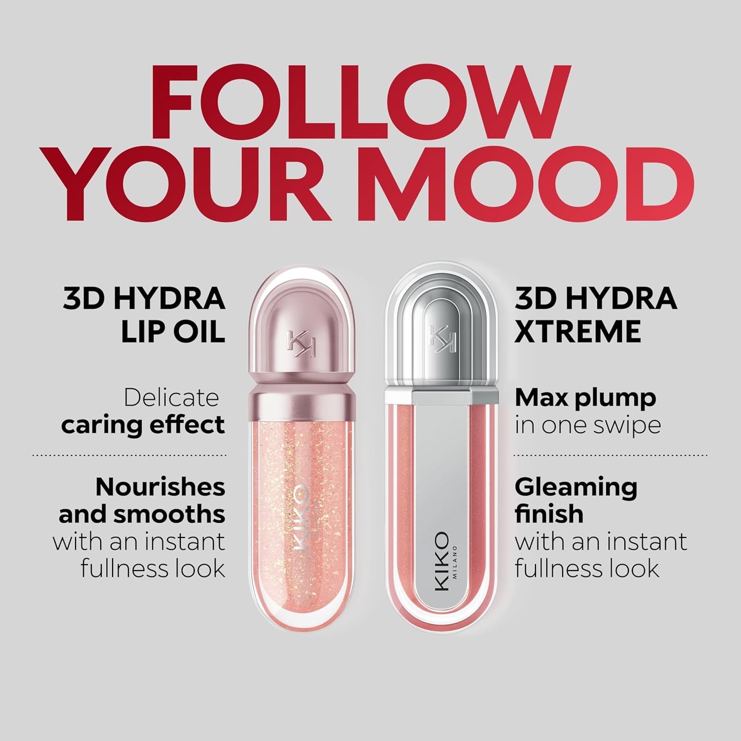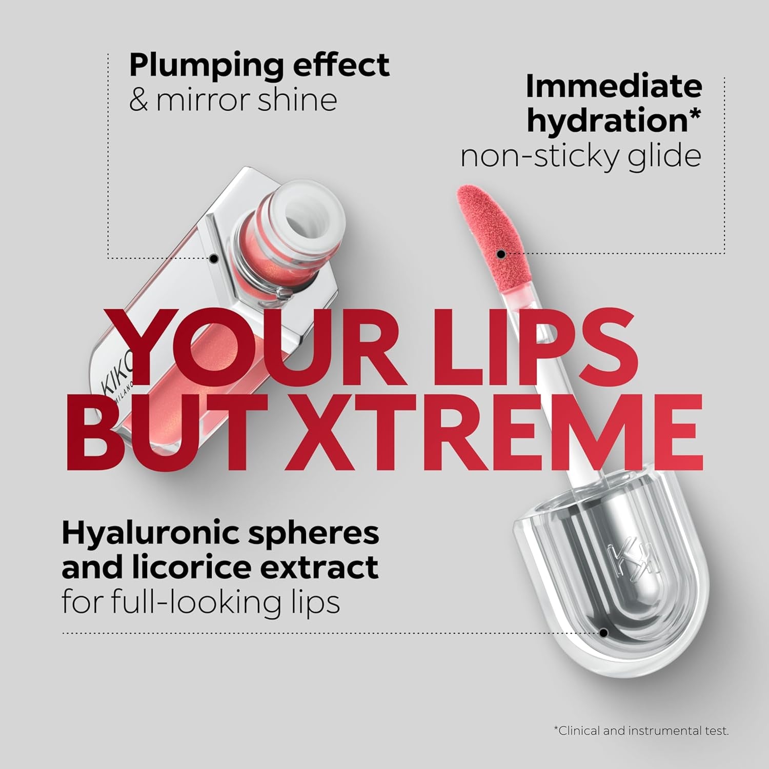 DESCRIPTION: Instant plumping, hydration* and shine like never before: KIKO's most viral and best-loved lip gloss, now in an extreme version. Indulge in a unique sensory experience and treat yourself to full, soft, radiant-looking lips with 3D volume from the very first stroke. A new era for your lips: -Extreme plumpness from the first application -Immediate hydration*, maximum comfort -Mirror-like shine thanks to ultra-reflective micro-pearls -Enriched with Hyaluronic Acid beads, ginger, liquorice extract, cupuaçu butter and natural oils -Lightweight, non-sticky texture -Luminous, versatile and sophisticated shades in nude and pink, iconic must-haves for your lip combos -Flocked-tip applicator for precise and fast application -An exclusive design with a reflective bottle to control your look whenever you want, wherever you are TEST:Dermatologically tested*Clinical and instrumental test RESULTS: Benefits of the volumising lip gloss:Lips are immediately moisturised* and soft, appearing fuller. Intense shine, volume and extreme comfort in just one coat. Discover your new Beauty BFF, KIKO’s best ever moisturising* and volumising lip gloss.HOW TO USE: How to apply the plumping lip gloss:Apply directly onto the lips using the flocked-tip applicator, starting in the centre and blending outwards. Reapply throughout the day to intensify the shine and plumping effect.WARNINGS: A slight tingling sensation after application is considered normal.PAO: 18 Made In: IT