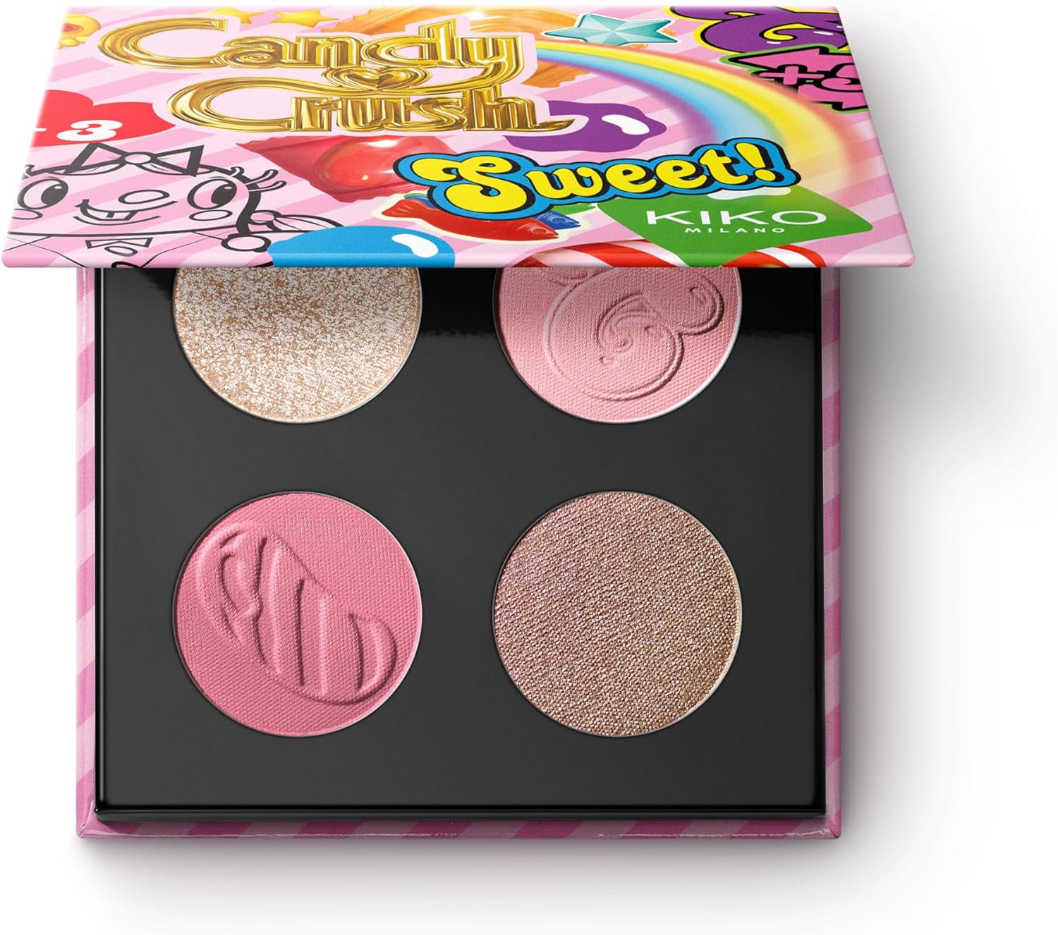 - A palette with four eyeshadows with matte, metallic and shiny finishes, inspired by the world's most famous candy game. For an irresistible touch of colour you can add to any eye look. Delicious!