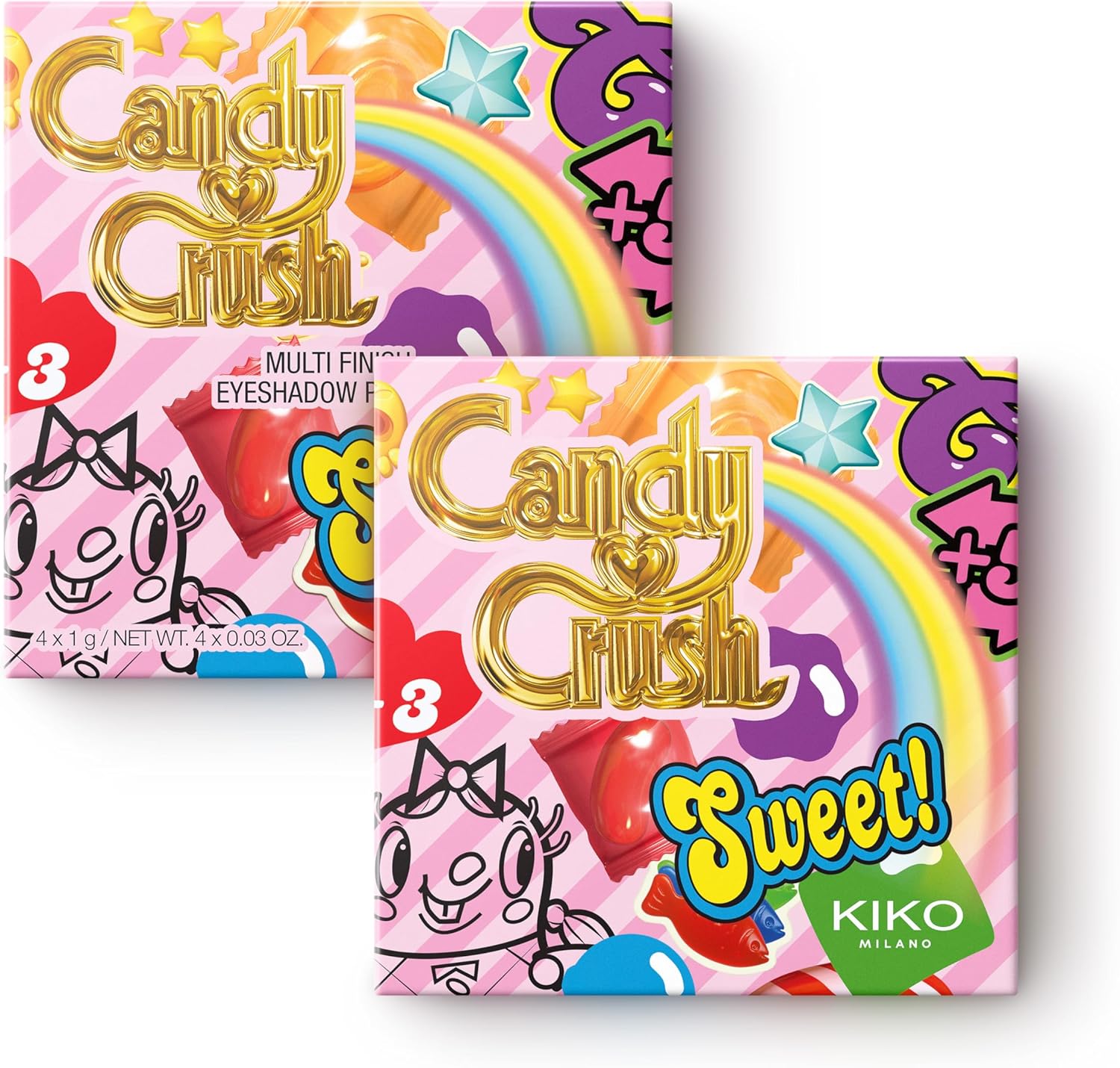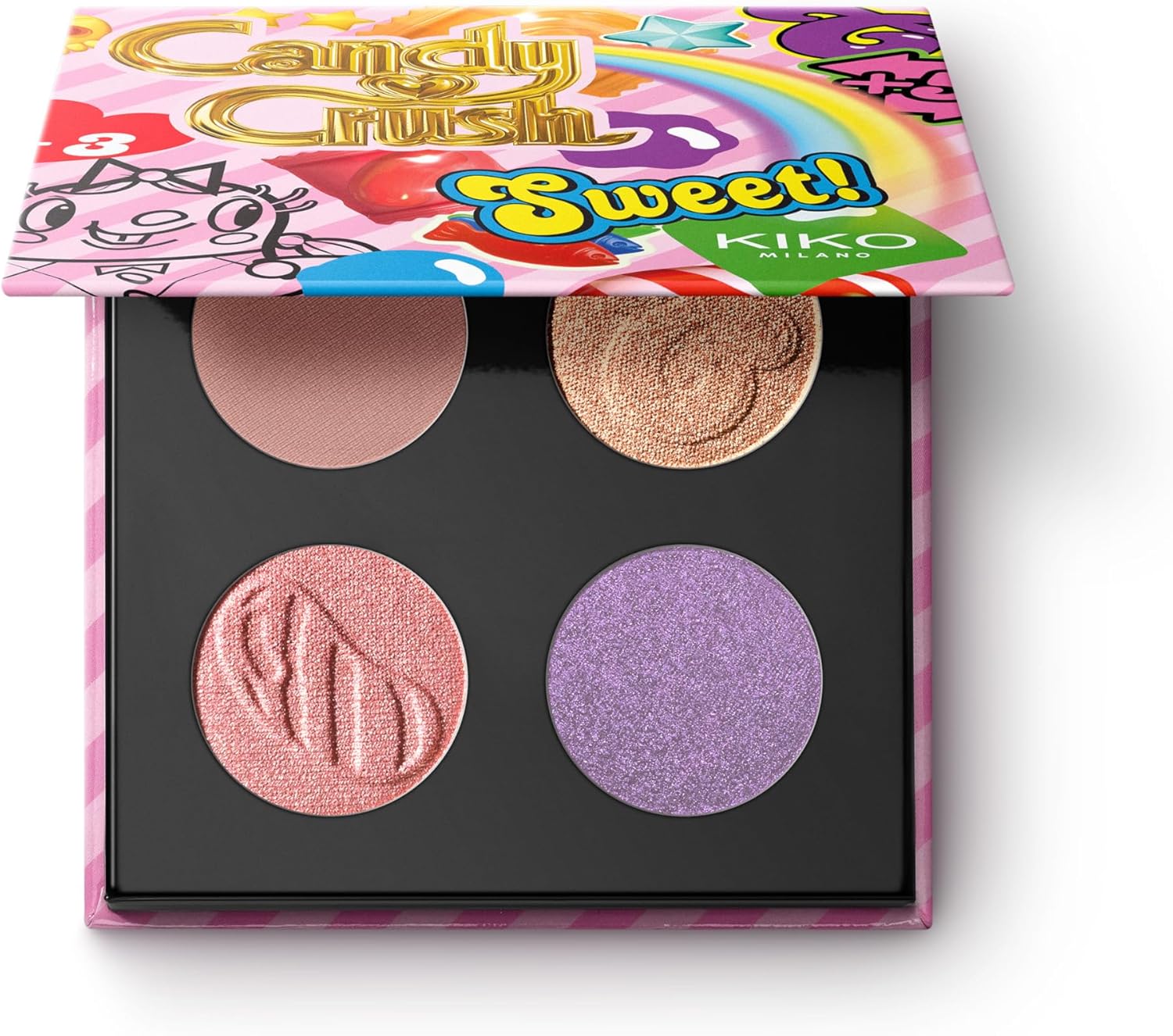 DESCRIPTION: A playful palette with four eyeshadows in matte, metallic and shiny finishes—inspired by the world’s most iconic candy game. Add a burst of irresistible colour to any eye look. Delicious and totally eye-catching!Why it’s super cool: -The unique, luxurious powder textures melt seamlessly onto the lids, delivering rich, vibrant colour -Comfortable to wear -Velvety and shimmering finishes work beautifully together -No fall-out, no mess -From soft rosy nudes to bold brights—play with endless colour combos -Adorable candy-inspired details on each pan make every swipe even more fun TEST: Ophthalmologically tested RESULTS: Every look turns into a playful pop of colour. A must-have for experimenting with bold, sweet, or anything in between. HOW TO USE: Apply and blend the eyeshadows directly onto your eyelids. For a flawlessly precise result, use an eye brush. PAO: 12 Made In: IT